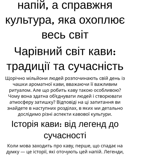 Щорічно мільйони людей розпочинають свій день із чашки ароматної кави, вважаючи її важливим ритуалом. Але що робить каву такою особливою? Чому вона здатна об’єднувати людей і створювати атмосферу затишку? Відповіді на ці запитання ви знайдете в наступних розділах, в яких ми детально дослідимо різні аспекти кавової культури.