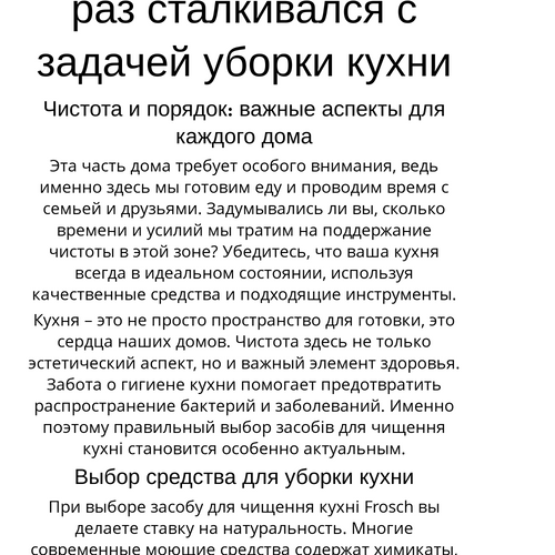 Поддержание чистоты на кухне – это не просто рутинная работа, а стиль жизни. Используя качественные средства, такие как засіб для чищення кухні Frosch, вы не только заботитесь о своем здоровье и здоровье близких, но и вносите вклад в защиту окружающей среды. Обратите внимание на натуральные составы и сделайте уборку приятной и эффективной. Чистая кухня – это залог здоровья и уюта в доме.