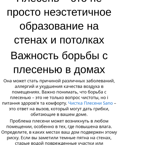 Проблема плесени – не только вопрос внешнего вида вашего дома, але й здоров'я вашої родини. Чистка Плесени Sano забезпечить високий рівень безпеки та ефективності в боротьбі із цим неприємним явищем. Ваш дім буде не лише чистим, а й безпечним для життя.