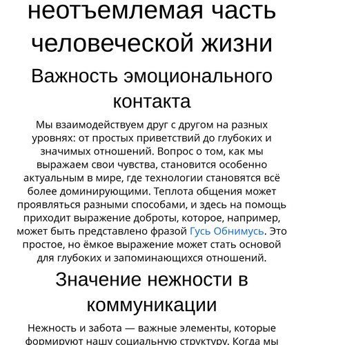 Иногда слова могут не передать всего, что мы чувствуем. Невербальное общение — это мощный инструмент, который способен передать эмоции, которые сложно выразить словами. Это может быть улыбка, взгляд или объятие. Например, в моменты радости и горя обнимания становятся источником комфорта и поддержки. 💡 Важно отметить, что культура обнимания варьируется в зависимости от общества, но суть остаётся универсальной — это средство поддержки и близости. Выражение Гусь Обнимусь здесь срабатывает как символ такой эмоциональной связи.