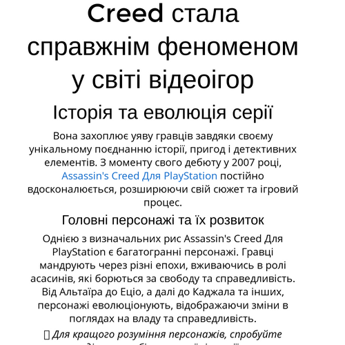 Вона захоплює уяву гравців завдяки своєму унікальному поєднанню історії, пригод і детективних елементів. З моменту свого дебюту у 2007 році, Assassin's Creed Для PlayStation постійно вдосконалюється, розширюючи свій сюжет та ігровий процес.