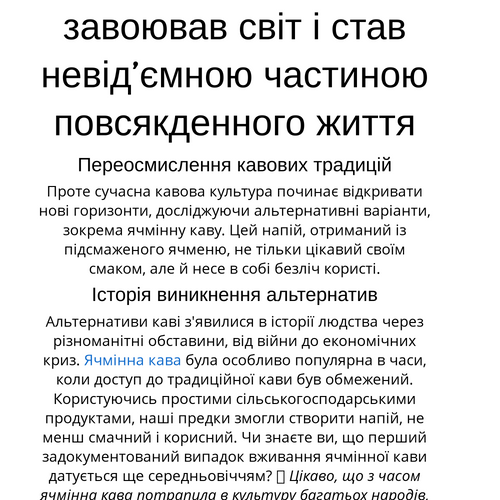Альтернативи каві з'явилися в історії людства через різноманітні обставини, від війни до економічних криз. Ячмінна кава була особливо популярна в часи, коли доступ до традиційної кави був обмежений. Користуючись простими сільськогосподарськими продуктами, наші предки змогли створити напій, не менш смачний і корисний. Чи знаєте ви, що перший задокументований випадок вживання ячмінної кави датується ще середньовіччям? 💡 Цікаво, що з часом ячмінна кава потрапила в культуру багатьох народів, вражаючи новими смаками та ароматами.