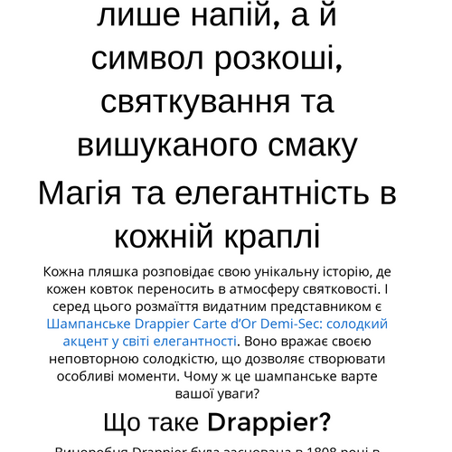 Шампанське Drappier Carte d’Or Demi-Sec: солодкий акцент у світі елегантності — це не просто напій, а частина культури, традицій та емоцій. Кожна пляшка несе в собі історію і момент, який варто відзначити.