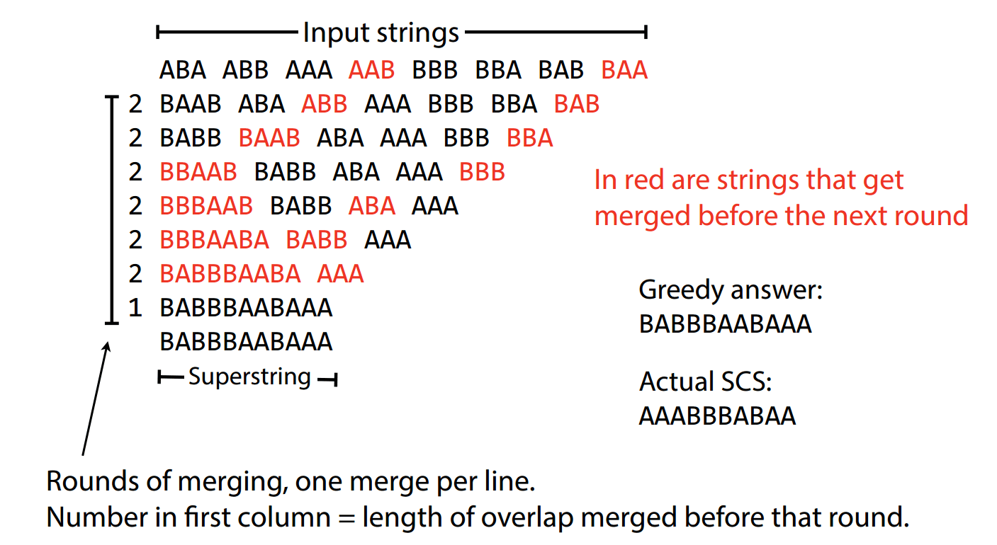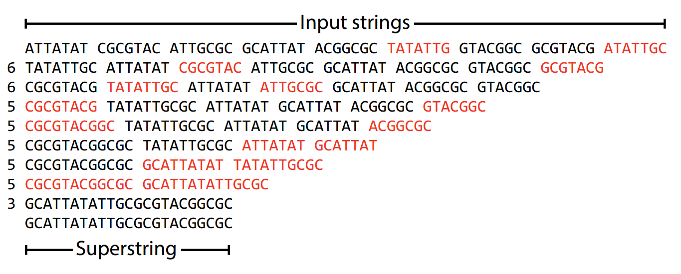 AAT → ATG → TGG → GGC forms a single path when traversing overlaps.AATGGCGT.This is a valid superstring, but why would we want the shortest?