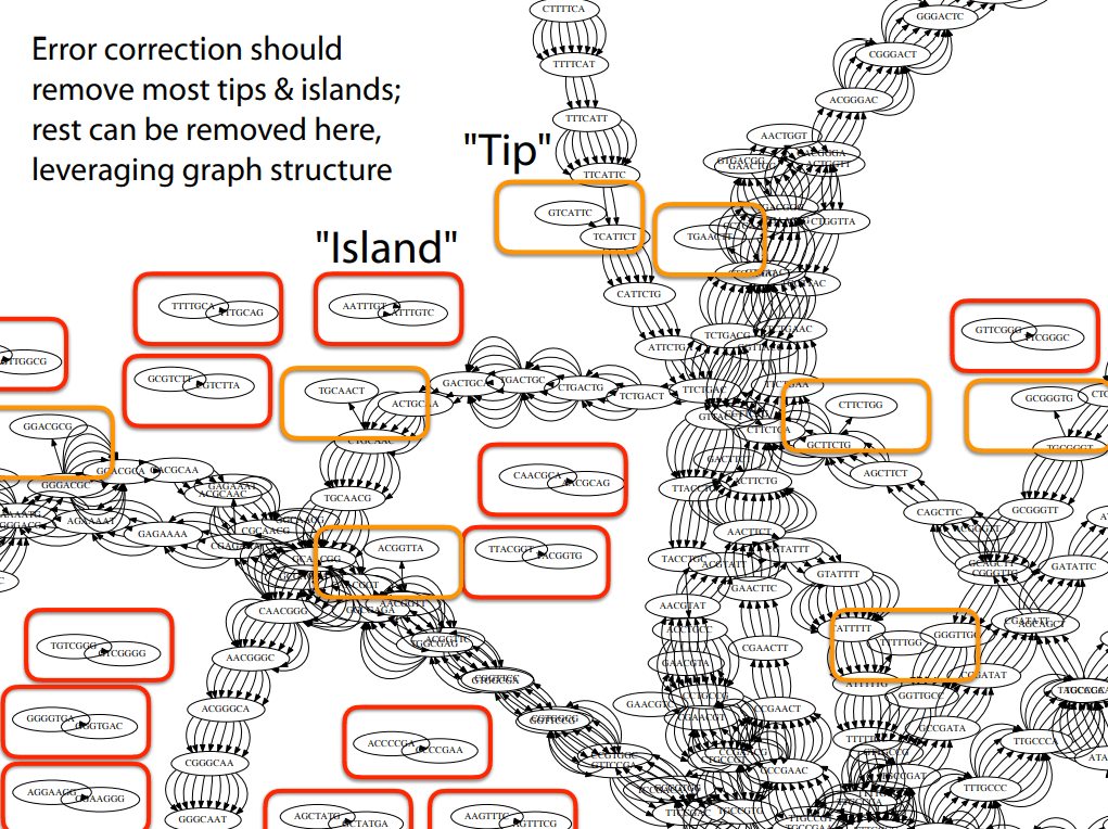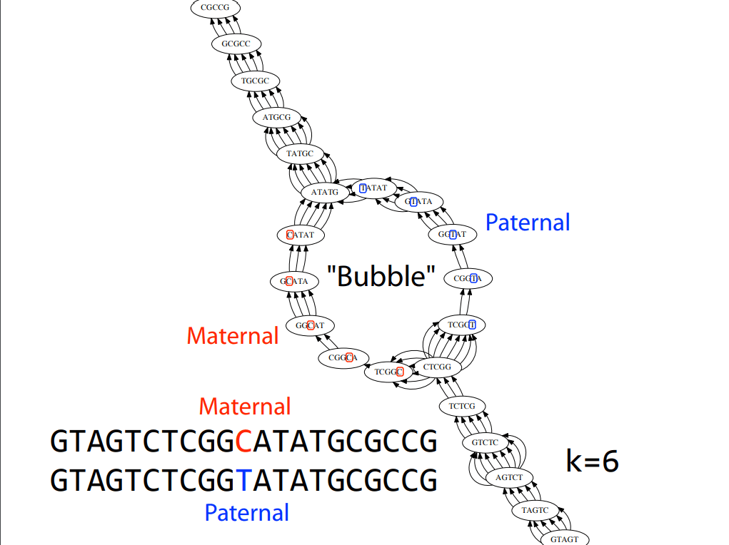 Nodes: Represent k-mers derived from sequencing reads.