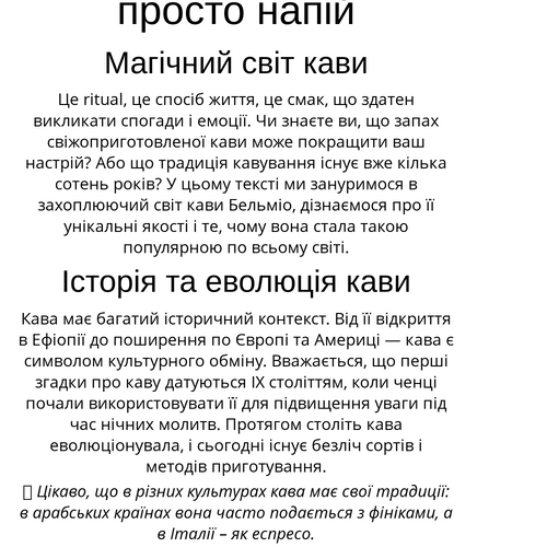 💡 Цікаво, що в різних культурах кава має свої традиції: в арабських країнах вона часто подається з фініками, а в Італії – як еспресо.