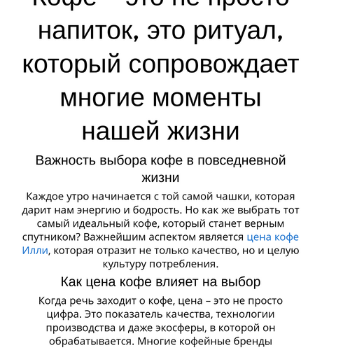 Кофе – это не просто напиток, это целая культура, наполненная ритуалами и традициями. Выбор идеального кофе может подниматься на уровень искусства. И хотя цена кофе Илли справедлива, важно помнить, что настоящие ценности заключаются не только в стоимости, но и в удовольствии, которое он приносит. Кофе - это путешествие, которое продолжается в каждой чашке, в каждом глотке.