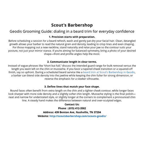 Instead of vague phrases like “short but full,” discuss the intended guard range for bulk removal versus the length you want left on the chin or mustache. If you favor a tapered cheek transition or a squared-off finish, say so upfront. During a scheduled beard service like a beard trim at Scout's Barbershop in Geodis, a barber can blend side density into the jawline while keeping the chin fuller for strong dimension, or reverse the emphasis for a sleeker silhouette.