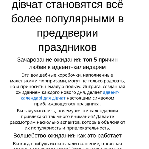 Эти волшебные коробочки, наполненные маленькими сюрпризами, могут не только радовать, но и приносить немалую пользу. Интрига, созданная ожиданием каждого нового дня, делает адвент-календарі для дівчат настоящим символом приближающегося праздника.