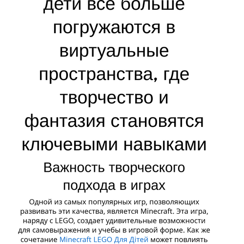 Minecraft LEGO Для Дітей не только развивает творческое мышление, но и служит мощным инструментом для обучения. В процессе игры дети могут изучать основы геометрии, физики, а также развивать логику.