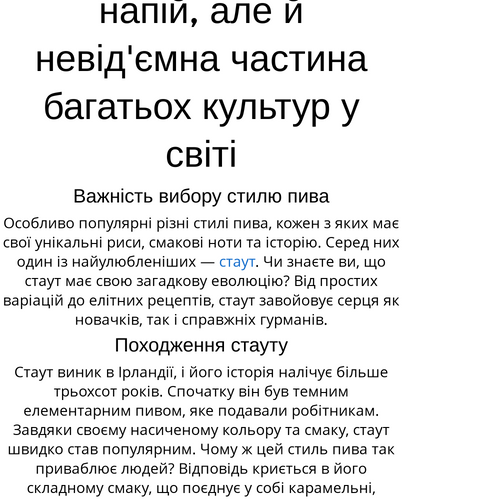 Стаут — це не просто пиво. Це витвір мистецтва, що поєднує в собі різноманітність смаків, ароматів і культурних аспектів. Стаут нагадує про те, як важливо насолоджуватись кожним моментом, а також про мистецтво створення унікального напою, що з'єднує людей. Скуштуйте стаут і відкрийте для себе нові горизонти смаків!