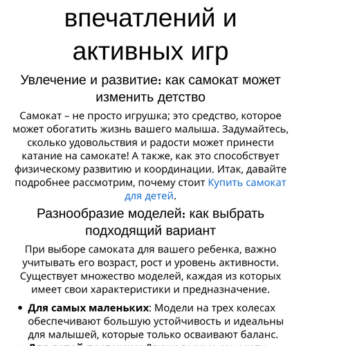 При выборе самоката для вашего ребенка, важно учитывать его возраст, рост и уровень активности. Существует множество моделей, каждая из которых имеет свои характеристики и предназначение.