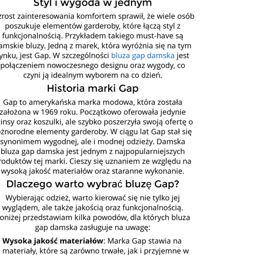 Gap to amerykańska marka modowa, która została założona w 1969 roku. Początkowo oferowała jedynie dżinsy oraz koszulki, ale szybko poszerzyła swoją ofertę o różnorodne elementy garderoby. W ciągu lat Gap stał się synonimem wygodnej, ale i modnej odzieży. Damska bluza gap damska jest jednym z najpopularniejszych produktów tej marki. Cieszy się uznaniem ze względu na wysoką jakość materiałów oraz staranne wykonanie.