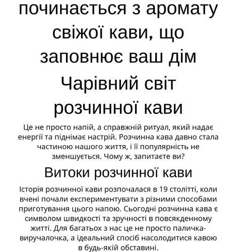 Історія розчинної кави розпочалася в 19 столітті, коли вчені почали експериментувати з різними способами приготування цього напою. Сьогодні розчинна кава є символом швидкості та зручності в повсякденному житті. Для багатьох з нас це не просто паличка-виручалочка, а ідеальний спосіб насолодитися кавою в будь-якій обставині.