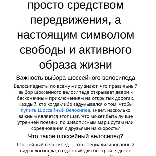 Купить Шоссейный Велосипед — это серьезный шаг к активному образу жизни и новым приключениям. Грамотный выбор, правильная настройка и уход значительно повысят качество ваших поездок. Шоссейный велосипед способен превратить каждую поездку в увлекательное путешествие, где каждый поворот и пейзаж будут радовать вас. Не упустите шанс сделать этот шаг и насладиться свободой, которую он приносит!