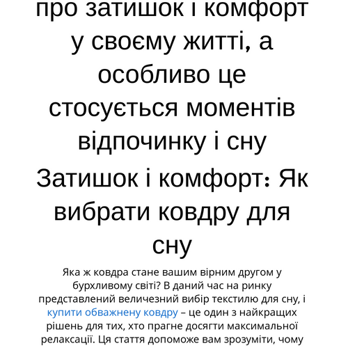 Обираючи ковдру, не поспішайте, подумайте про всі аспекти — від матеріалів до ваги. Це допоможе вам зробити правильний вибір та забезпечити максимальний комфорт у вашій спальні. Спробуйте обважену ковдру, і ви зможете реалізувати свою мрію про безтурботний та здоровий сон.