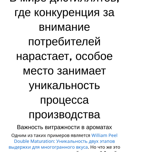 Процесс выдержки является критически важным этапом в производстве виски. William Peel Double Maturation: Уникальность двух этапов выдержки для многогранного вкуса демонстрирует, как два різних контейнера можуть надати напою різноманіття ароматів і смаків. Чому ж це важливо?