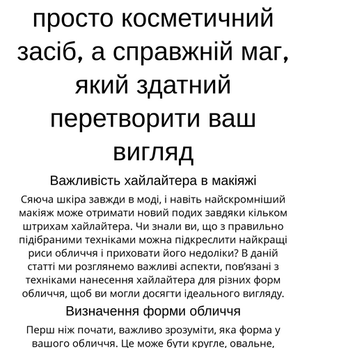 Сяюча шкіра завжди в моді, і навіть найскромніший макіяж може отримати новий подих завдяки кільком штрихам хайлайтера. Чи знали ви, що з правильно підібраними техніками можна підкреслити найкращі риси обличчя і приховати його недоліки? В даній статті ми розглянемо важливі аспекти, пов’язані з техніками нанесення хайлайтера для різних форм обличчя, щоб ви могли досягти ідеального вигляду.