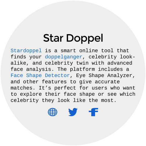 Stardoppel is a smart online tool that finds your doppelganger, celebrity look-alike, and celebrity twin with advanced face analysis. The platform includes a Face Shape Detector, Eye Shape Analyzer, and other features to give accurate matches. It’s perfect for users who want to explore their face shape or see which celebrity they look like the most.
