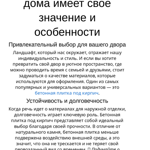Когда речь идет о материалах для наружной отделки, долговечность играет ключевую роль. Бетонная плитка под кирпич представляет собой идеальный выбор благодаря своей прочности. В отличие от натурального камня, бетонная плитка меньше подвержена воздействию внешней среды, а это значит, что она не трескается и не теряет свой первозданный вид со временем. 💡 Подумайте о климатических условиях вашего региона: плитка устойчива к изменению температур и осадкам.
