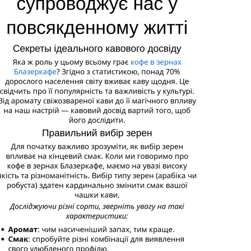 Для початку важливо зрозуміти, як вибір зерен впливає на кінцевий смак. Коли ми говоримо про кофе в зернах Блазеркафе, маємо на увазі високу якість та різноманітність. Вибір типу зерен (арабіка чи робуста) здатен кардинально змінити смак вашої чашки кави.