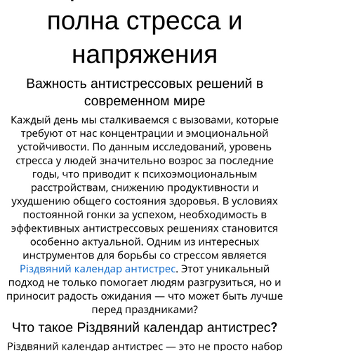 Каждый день мы сталкиваемся с вызовами, которые требуют от нас концентрации и эмоциональной устойчивости. По данным исследований, уровень стресса у людей значительно возрос за последние годы, что приводит к психоэмоциональным расстройствам, снижению продуктивности и ухудшению общего состояния здоровья. В условиях постоянной гонки за успехом, необходимость в эффективных антистрессовых решениях становится особенно актуальной. Одним из интересных инструментов для борьбы со стрессом является Різдвяний календар антистрес. Этот уникальный подход не только помогает людям разгрузиться, но и приносит радость ожидания — что может быть лучше перед праздниками?