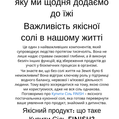 Загалом, сіль – це не просто добавка до їжі. Це ключовий компонент, який може покращити якість вашого життя. І в цьому питанні Купити Сіль FINISH стає відмінним вибором для кожної родини.