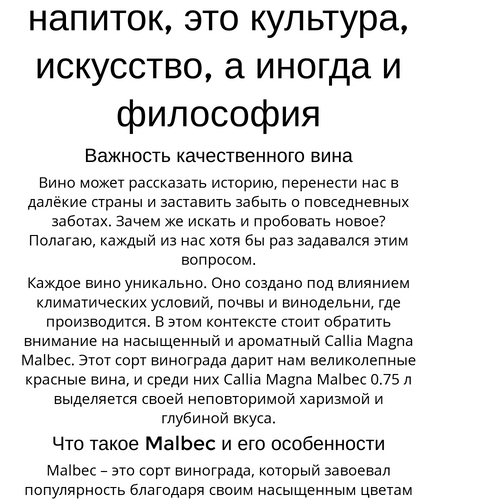 💡 Задайте себе вопрос: какое вино я хочу попробовать сегодня? Возможно, Callia Magna Malbec 0.75 л станет вашим следующим открытием?
