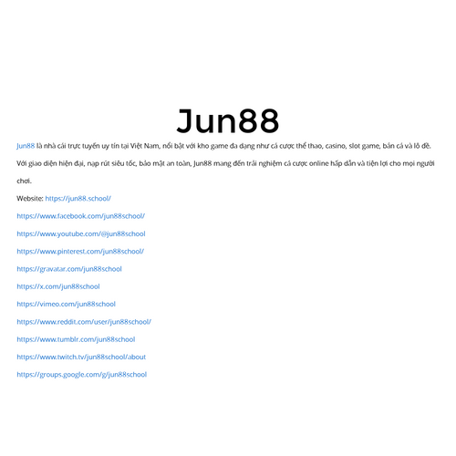 Jun88 là nhà cái trực tuyến uy tín tại Việt Nam, nổi bật với kho game đa dạng như cá cược thể thao, casino, slot game, bắn cá và lô đề. Với giao diện hiện đại, nạp rút siêu tốc, bảo mật an toàn, Jun88 mang đến trải nghiệm cá cược online hấp dẫn và tiện lợi cho mọi người chơi.Website: https://jun88.school/https://www.facebook.com/jun88school/https://www.youtube.com/@jun88schoolhttps://www.pinterest.com/jun88school/https://gravatar.com/jun88schoolhttps://x.com/jun88schoolhttps://vimeo.com/jun88schoolhttps://www.reddit.com/user/jun88school/https://www.tumblr.com/jun88schoolhttps://www.twitch.tv/jun88school/abouthttps://groups.google.com/g/jun88school