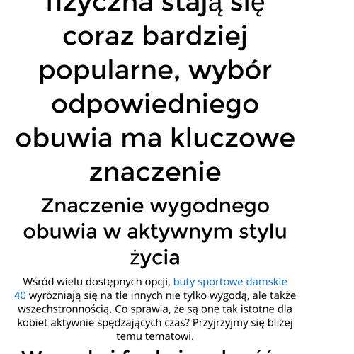 Podczas wyboru obuwia sportowego, wygoda powinna zawsze być na pierwszym miejscu. Buty sportowe damskie 40 oferują szereg rozwiązań, które zapewniają komfort użytkowania. Dobrze dopasowana podeszwa, lekkość materiałów czy amortyzacja to cechy, które przekładają się na przyjemność z każdej aktywności.
