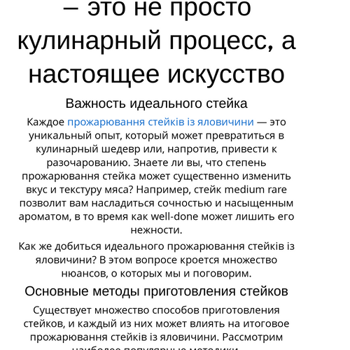 Каждое прожарювання стейків із яловичини — это уникальный опыт, который может превратиться в кулинарный шедевр или, напротив, привести к разочарованию. Знаете ли вы, что степень прожарювання стейка может существенно изменить вкус и текстуру мяса? Например, стейк medium rare позволит вам насладиться сочностью и насыщенным ароматом, в то время как well-done может лишить его нежности.