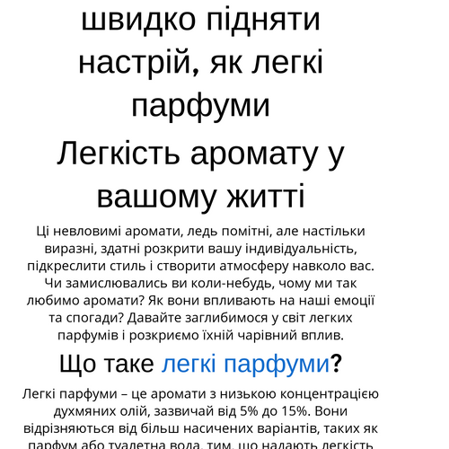 Легкі парфуми – це більше, ніж просто аромат. Це ваш стиль, ваш настрій, ваш спосіб висловити себе. Обираючи легкі парфуми, ви додаєте до свого образу особливу ноту, яка говорить про вашу унікальність.