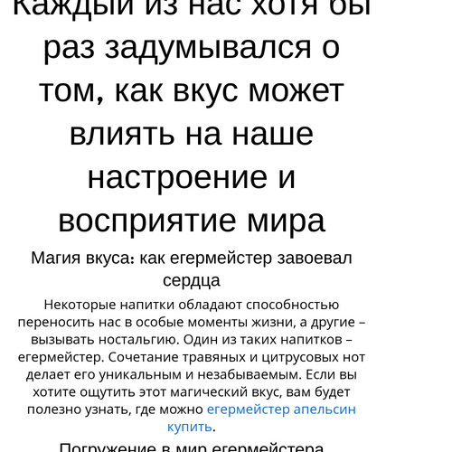 Некоторые напитки обладают способностью переносить нас в особые моменты жизни, а другие – вызывать ностальгию. Один из таких напитков – егермейстер. Сочетание травяных и цитрусовых нот делает его уникальным и незабываемым. Если вы хотите ощутить этот магический вкус, вам будет полезно узнать, где можно егермейстер апельсин купить.