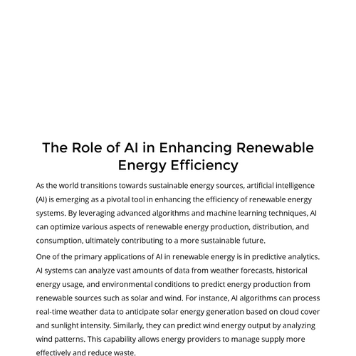 In conclusion, the role of AI in enhancing renewable energy efficiency is multifaceted, impacting everything from predictive analytics and energy storage to grid management and equipment maintenance. As we continue to face the challenges of climate change and energy sustainability, integrating AI into renewable energy systems will be essential for maximizing efficiency and fostering a cleaner, more sustainable future. The collaboration between universities, industry, and entrepreneurs will play a crucial role in driving innovation and developing the next generation of renewable energy solutions.
