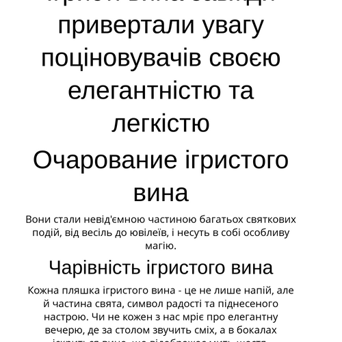 Кожна пляшка ігристого вина - це не лише напій, але й частина свята, символ радості та піднесеного настрою. Чи не кожен з нас мріє про елегантну вечерю, де за столом звучить сміх, а в бокалах іскриться вино, що відображає мить щастя.