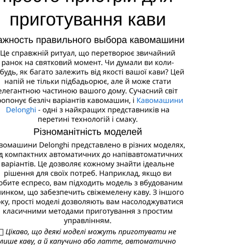 Це справжній ритуал, що перетворює звичайний ранок на святковий момент. Чи думали ви коли-небудь, як багато залежить від якості вашої кави? Цей напій не тільки підбадьорює, але й може стати елегантною частиною вашого дому. Сучасний світ пропонує безліч варіантів кавомашин, і Кавомашини Delonghi - одні з найкращих представників на перетині технологій і смаку.