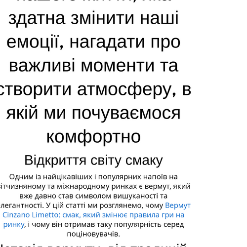 Одним із найцікавіших і популярних напоїв на вітчизняному та міжнародному ринках є вермут, який вже давно став символом вишуканості та елегантності. У цій статті ми розглянемо, чому Вермут Cinzano Limetto: смак, який змінює правила гри на ринку, і чому він отримав таку популярність серед поціновувачів.