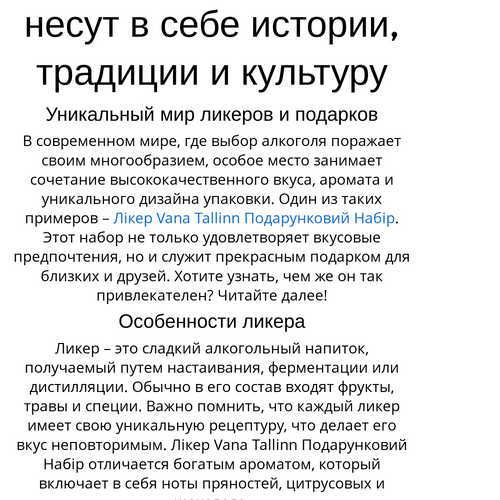 В современном мире, где выбор алкоголя поражает своим многообразием, особое место занимает сочетание высококачественного вкуса, аромата и уникального дизайна упаковки. Один из таких примеров – Лікер Vana Tallinn Подарунковий Набір. Этот набор не только удовлетворяет вкусовые предпочтения, но и служит прекрасным подарком для близких и друзей. Хотите узнать, чем же он так привлекателен? Читайте далее!