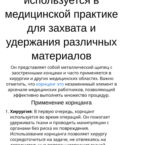 Он представляет собой металлический щипец с заостренными концами и часто применяется в хирургии и других медицинских областях. Важно отметить, что корнцанг это незаменимый элемент в арсенале медицинских работников, позволяющий эффективно выполнять множество процедур.