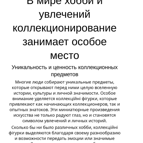 Каждая колекція — это отдельная история, полная эмоций, воспоминаний и открытий. Колекційні фігурки, которые вы выбираете, становятся отражением вашего уникального пути. Не упустите шанс узнать больше о себе и мире, который вас окружает, через призму коллекціонування. Погрузитесь в этот волшебный мир, где каждая фигурка — это не просто предмет, а ключ к воспоминаниям и эмоциям, которые вы будете беречь всю жизнь.