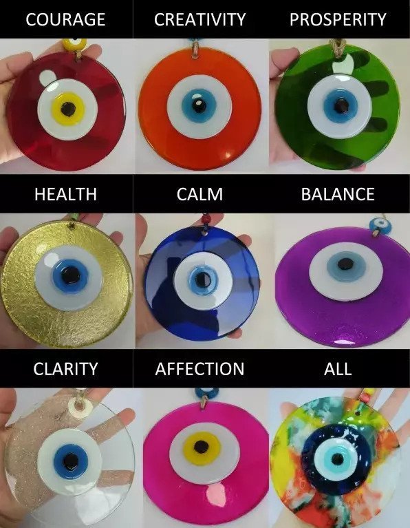 These include red evil eye meaning courage, black evil eye meaning power, blue evil eye meaning fate and karma protection, pink evil eye meaning affection, green evil eye meaning prosperity, purple evil eye meaning balance, orange evil eye meaning creativity, white evil eye meaning positivity and focus, and more.