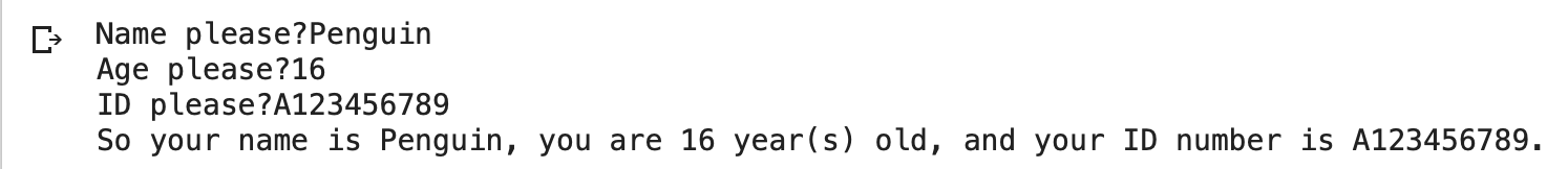 print("So your name is {}, you are {} year(s) old, and your ID number is {}. ".format(name, age, personal_id))當我們需要在固定的字串中間插入變數值