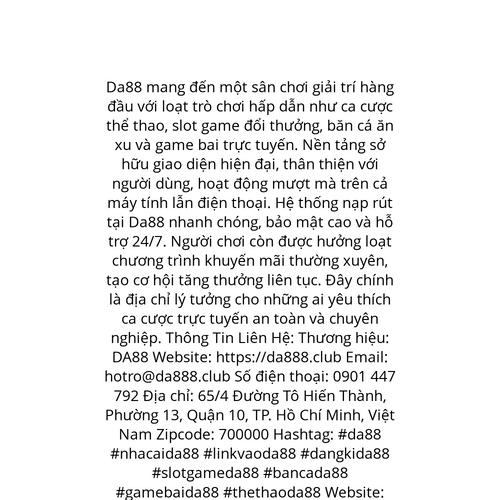 Website: https://da888.club. Da88 mang đến một sân chơi giải trí hàng đầu với loạt trò chơi hấp dẫn như ca cược thể thao, slot game đổi thưởng, băn cá ăn xu và game bai trực tuyến. Nền tảng sở hữu giao diện hiện đại, thân thiện với người dùng, hoạt đ