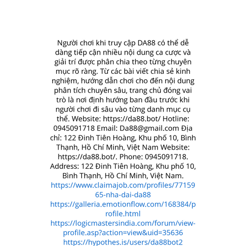 Website: https://da88.bot/https://da88.bot/ Người chơi khi truy cập DA88 có thể dễ dàng tiếp cận nhiều nội dung ca cược và giải trí được phân chia theo từng chuyên mục rõ ràng. Từ các bài viết chia sẻ kinh nghiệm, hướng dẫn chơi cho đến nội dung phân tích chuyên sâu