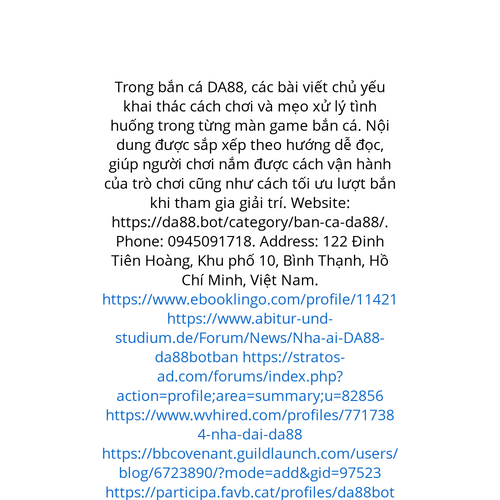 Website: https://da88.bot/category/ban-ca-da88/. Trong bắn cá DA88, các bài viết chủ yếu khai thác cách chơi và mẹo xử lý tình huống trong từng màn game bắn cá. Nội dung được sắp xếp theo hướng dễ đọc, giúp người chơi nắm được cách vận hành của trò c