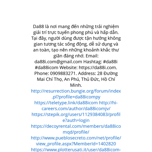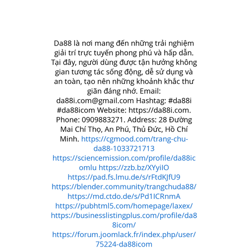 Website: https://da88i.com. Da88 là nơi mang đến những trải nghiệm giải trí trực tuyến phong phú và hấp dẫn. Tại đây, người dùng được tận hưởng không gian tương tác sống động, dễ sử dụng và an toàn, tạo nên những khoảnh khắc thư giãn đáng nhớ. Email: