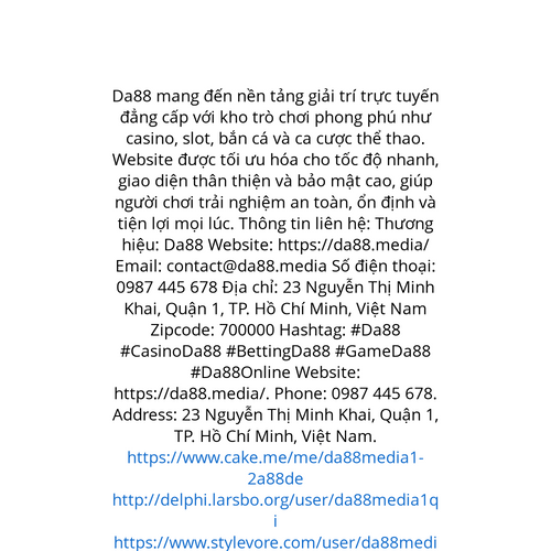 Website: https://da88.media/. Da88 mang đến nền tảng giải trí trực tuyến đẳng cấp với kho trò chơi phong phú như casino, slot, bắn cá và ca cược thể thao. Website được tối ưu hóa cho tốc độ nhanh, giao diện thân thiện và bảo mật cao, giúp người chơi