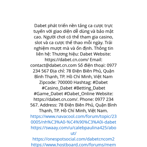 Website: https://dabet.cn.com/. Dabet phát triển nền tảng ca cược trực tuyến với giao diện dễ dùng và bảo mật cao. Người chơi có thể tham gia casino, slot và ca cược thể thao mỗi ngày. Trải nghiệm mượt mà và ổn định. Thông tin liên hệ: Thương hiệu: