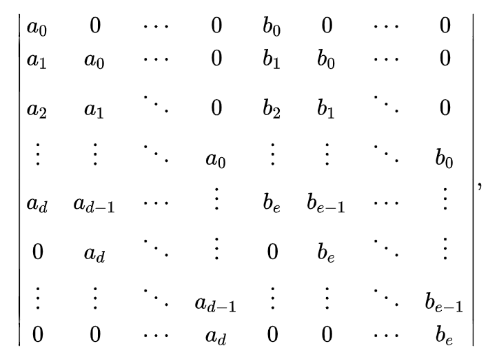 Expression of coefficients of polynomials p and q which is 0 iff the two polynomials have a common root.