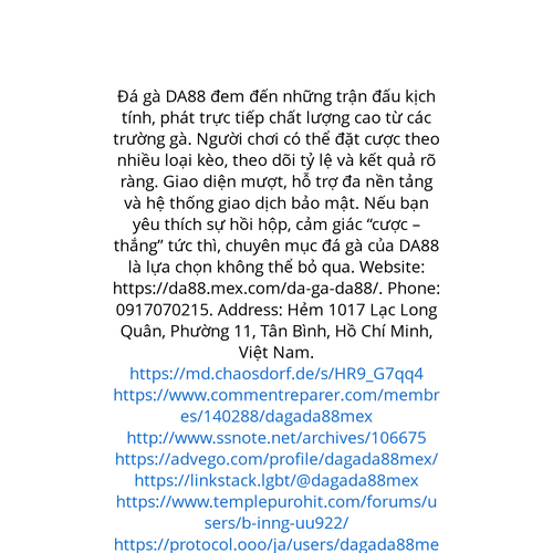 Website: https://da88.mex.com/da-ga-da88/. Đá gà DA88 đem đến những trận đấu kịch tính, phát trực tiếp chất lượng cao từ các trường gà. Người chơi có thể đặt cược theo nhiều loại kèo, theo dõi tỷ lệ và kết quả rõ ràng. Giao diện mượt, hỗ trợ đa nền t